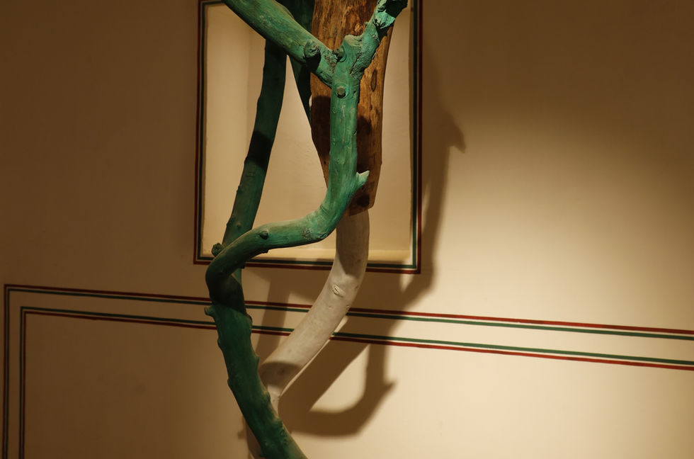 With a career as a sculptor which spans six decades, Katt would cite two primary influences on her work: Nature and the city where she chose to live for most of her life: Varanasi. While she had worked extensively in a figurative mode, with some important commissions under her belt, it is for her abstract work that she is primarily known. She worked with every material possible and exhaustively explored all methods: modelling, carving, and casting. In the exhibition we have three varieties of her work, with a group of twenty new works which combine cast bronze with carved stone on display in one courtyard. These works, collectively entitled the “Abandoned” series, start with bronzes that have been cast from waxes concocted by the artist. These bronzes are then mounted within larger stones, of varying types, as a gem might be set into a gold or silver mount for presentation as a brooch. The two different materials fuse together into a new, sympathetic configuration that might resemble an archeological dig, a technological device, a surgical implant, or forgotten architecture. Also on view are two sculptures made solely from terracotta clay that speak to the artist’s interest in insects, as they bear similarities with termite mounds or wasp nests. To finish are two large sculptures of wood that are suspended from the ceiling, one with the addition of some copper elements, that exploit the characteristics of found branches and their linearity.