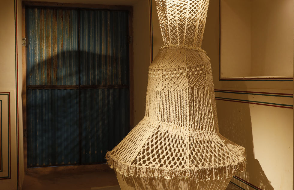 Payal Jain is a well-known fashion designer based in New Delhi who has been creating collections of garments in a variety of styles for thirty years. The works in the exhibition are only four examples from a much larger body of work Jain created entitled “Soul of a Woman” in order to commemorate her three decades of fashion, allowing herself to experiment with a more abstract language for the occasion. She limits herself to only a few materials, predominantly cotton and repurposed yarn, and a single color, ivory, so as to give emphasis to the forms themselves, many of which only barely resemble anything that could be said to be “clothing.” Both free-standing and suspended, the pieces on display have the human body as their starting point but Jain also allows herself to explore and exploit the qualities of her materials, abandoning functionality completely and venturing into the territory of Fiber Art.