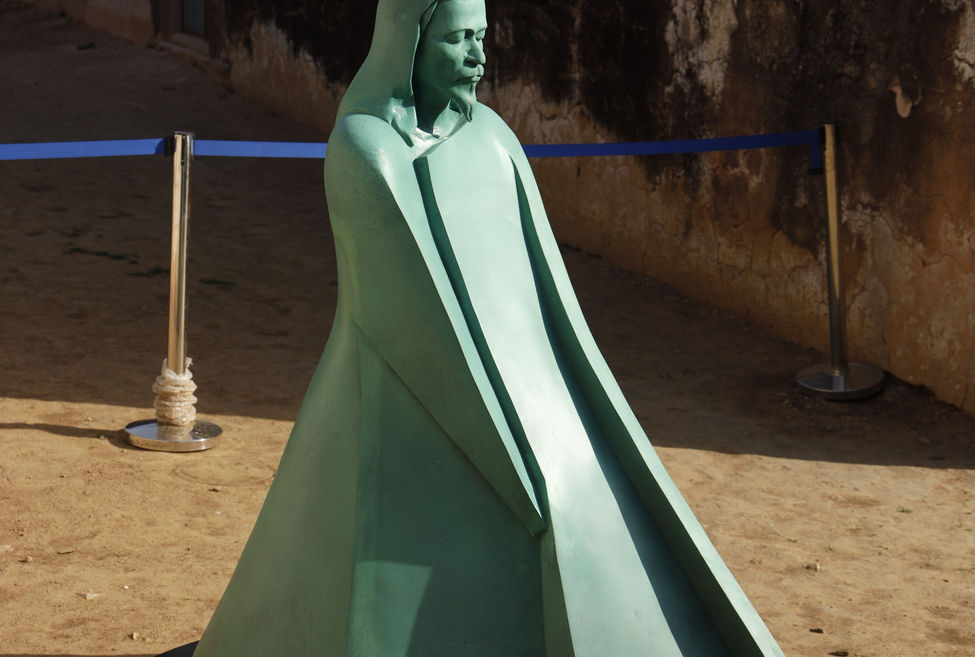 Titled after Pieter Bruegel’s painting, the allegorical work “The Misanthrope,” Natesan’s sculpture entitled “Misanthrope II” is a self-portrait, casting the artist in the eponymous role. The figure of the misanthrope is a self-contained one, his form disappearing behind a mountain-like cloak. Natesan has worked with sharp angles and planes to create an ambiguity in the work, with nothing given away behind the folds of the cloak. The choice of minimalism here highlights the details of the revealed head, acting as a key to the sculpture. The structure also reminds a familiar viewer of Natesan’s recent series of landscape paintings, where mountains have long replaced men as the object of the artist’s work. The artist’s turn toward still life and landscape has been marked by not only an artistic shift in the linguistic possibilities of art, but in a deliberate turn away from the sociopolitical, an artist’s form of resistance. Amidst this reference to art history as well as his own reflections, only the artist’s head remains visible. Here, too, the eyes remain closed to the surrounding world. The work seems to remind one of the aphorism that underscored Bruegel’s moralist work: “Because the world is so deceitful, I go in mourning.”